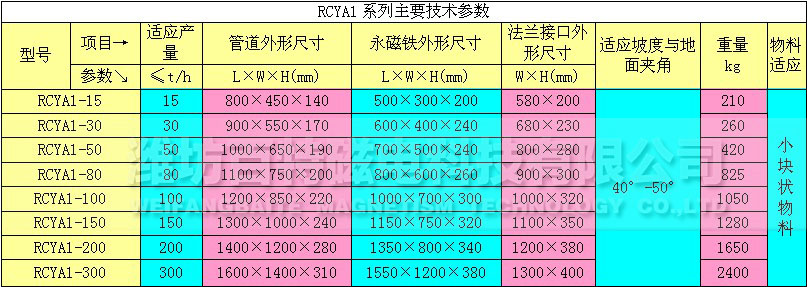 RCYA(1)系列管道永磁除鐵器包括無磁管道和永磁鐵兩部分,專用于對封閉管道內(nèi)非磁性物料的除鐵,永磁除鐵器內(nèi)部采用高性能的硬磁材料組成復合磁系。具有體積小、磁力大、重量輕、除鐵干凈、方便、無能耗、使用壽命長等特點。適合沒有輸送皮帶,只能提供下料溜槽的場合。當散狀物料經(jīng)過管道式永磁鐵除鐵器時,鐵雜物被高場強的永磁鐵所吸附,清除鐵雜質(zhì)時,打開管道專用門將雜質(zhì)取除。主要應用于水泥、化工、塑料、耐火材料、建材等行業(yè)的下料管道中清除雜物.